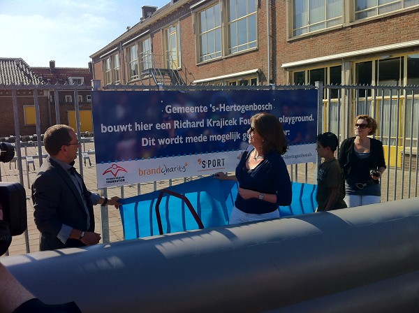 Woensdagmiddag 1 juni werd de bouw gestart van de tweede playground van Den Bosch. Deze komt in de wijk de Vliert mede op basis van de sponsoring door Brand Charity. Brand Charity is een onderdeel van het bedrijf Brand Royalty dat vorig jaar op 4 juni een te gekke sportdag had georganiseerd in Assen voor kinderen van onze playgrounds. Op de foto Suzan Vervoorn en Linda Daams van Brand Charity, wethouder jeugd Bart Eigenmann en jongere Nosayr.